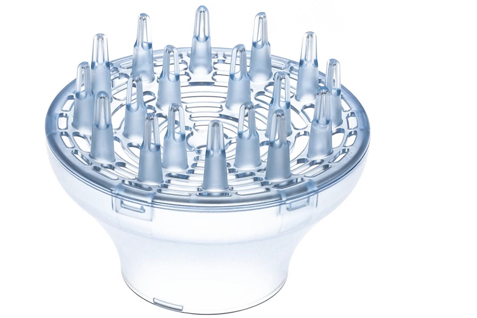 A diffúzor elosztja a légáramot a haján, dúsítva és simává téve azt. A legjobb eredmény érdekében tartsa a diffúzort közel a fejtetőhöz, illetve a hajgyökerekhez. A diffúzor finom bevonatú tüskéi dúsítják, maximálisan vastaggá, ruganyossá teszik a haját, és segítenek a loknik kialakításában.