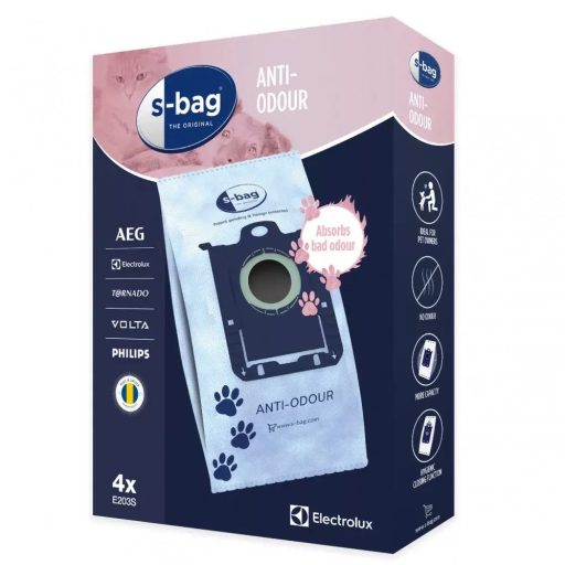 A hagyományos porszívóporzsákokkal ellentétben az Anti-Odour s-bag® szagelnyelő viaszréteggel bevont, ellenálló, szintetikus anyagból készül, amely így csapdába ejti a kellemetlen szagokat, és megakadályozza, hogy megszökjenek a porszívóból. Ez a porszívóporzsák ideális a kisállattartók számára.